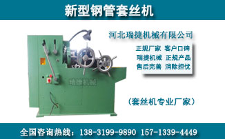 瑞捷套絲機設備采用液壓裝置成功解決勞動強度大,效率低,且無定位裝置,絲扣長短難控制等弊端,可一次型完成螺紋加工成型且螺紋牙形飽滿光滑。套絲機的主要部件及結構是由套絲機床的傳動系統(tǒng),支架系統(tǒng),切線板牙頭,定位裝置及液壓系統(tǒng)組成,工作時只要將工件裝入夾鉗,其余程序?qū)⒆詣油瓿桑僮骱唵危ㄋ滓锥鸾萏捉z機廠家直銷,質(zhì)量有保證,減少不必要的中間環(huán)節(jié),為客戶帶來實實在在的優(yōu)惠政策,歡迎新老客戶洽談合作事宜和來電咨詢.